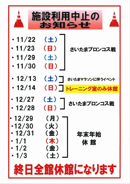 ※12月14日(日)はトレーニング室・会議室のみお休みとなります(さいたまマラソンイベント開催のため)
